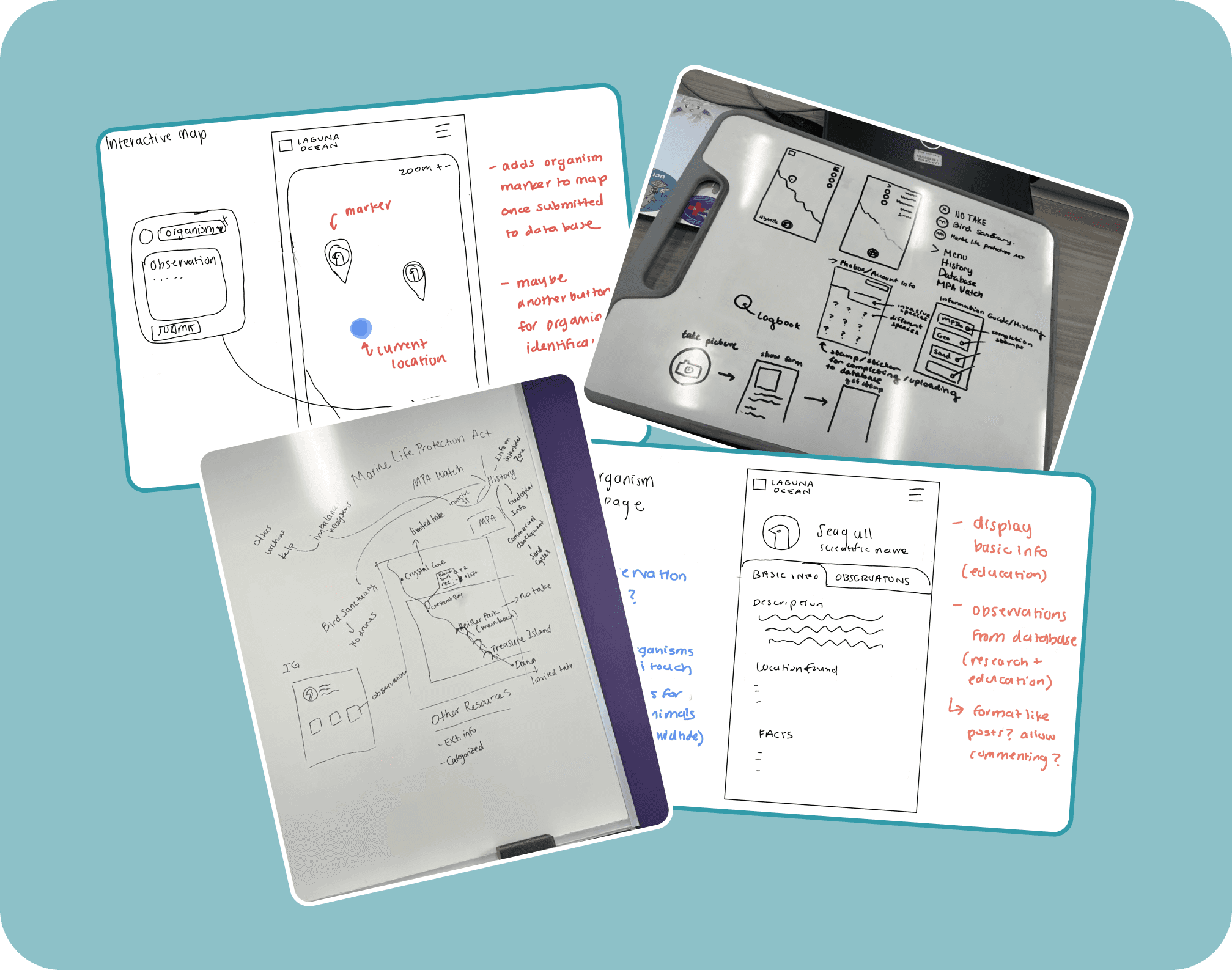 Ideas that stood out were: an educational field guide to help visitors access relevant and important information, an interactive map allowing visitors to navigate the beach and log their findings as part of the citizen science program, and a logbook that allows visitors to save their findings
