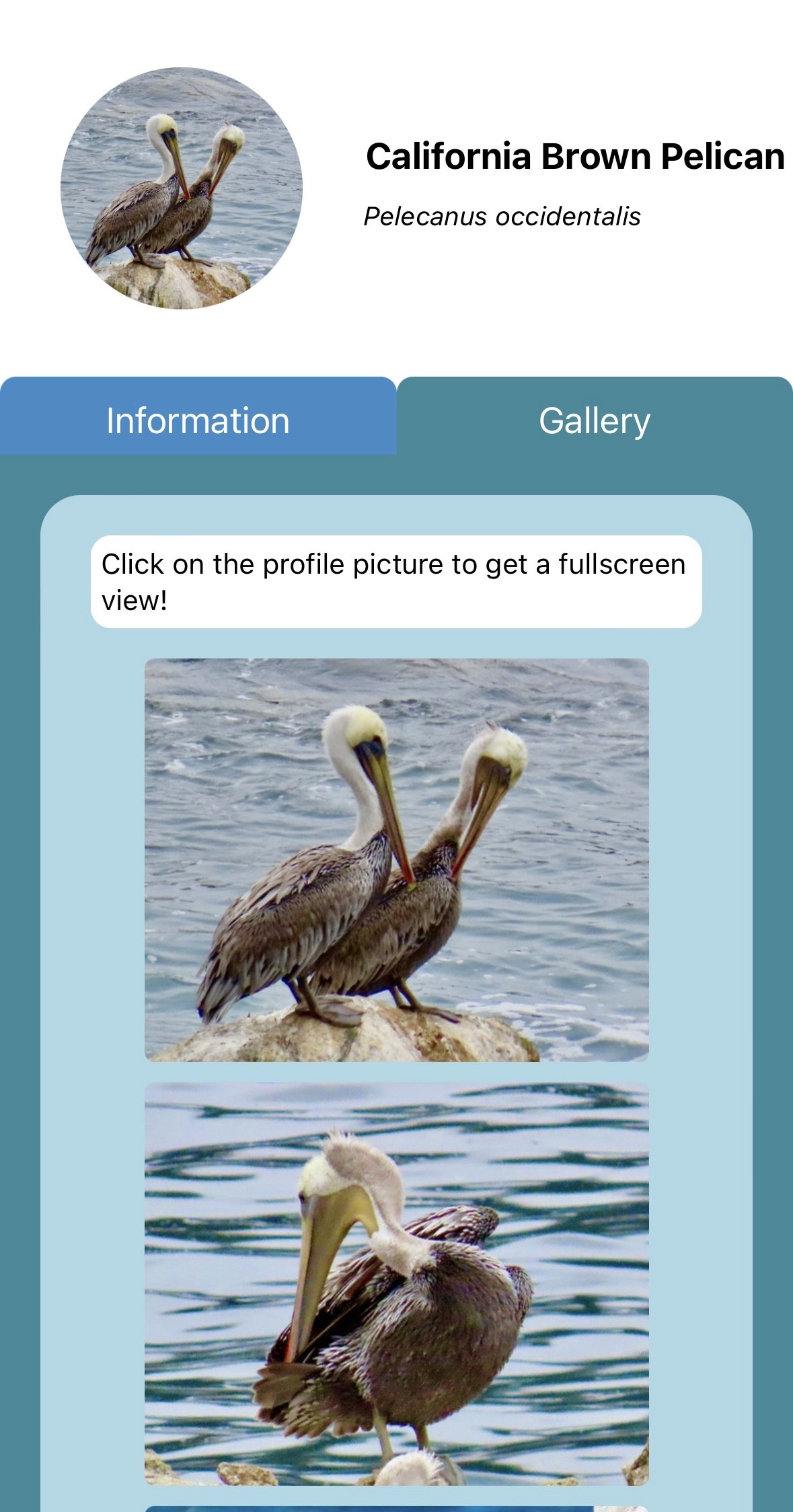 Each species at Laguna Beach would have it's own respective page containing relevant information and images taken from observations submitted by visitors.