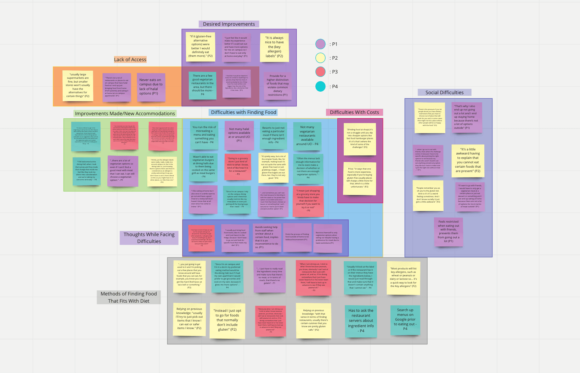 After individually coding our transcripts, we came together and categorized the data into an affinity diagram using Miro, grouping together similar observations and quotes under relevant thematic categories.