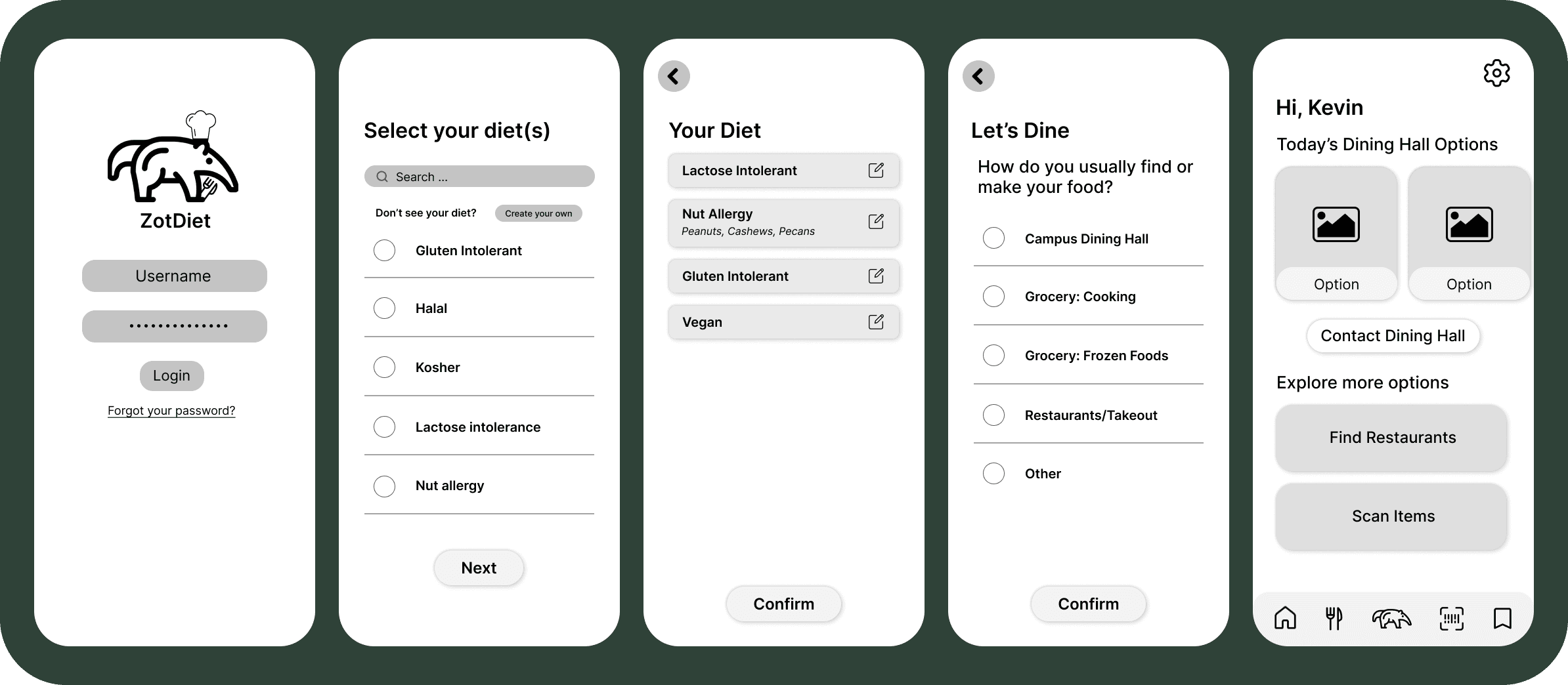 ZotDiet is a conceptual mobile application that UCI students can use to find food items and nearby food establishments that accomodate their dietary restrictions.