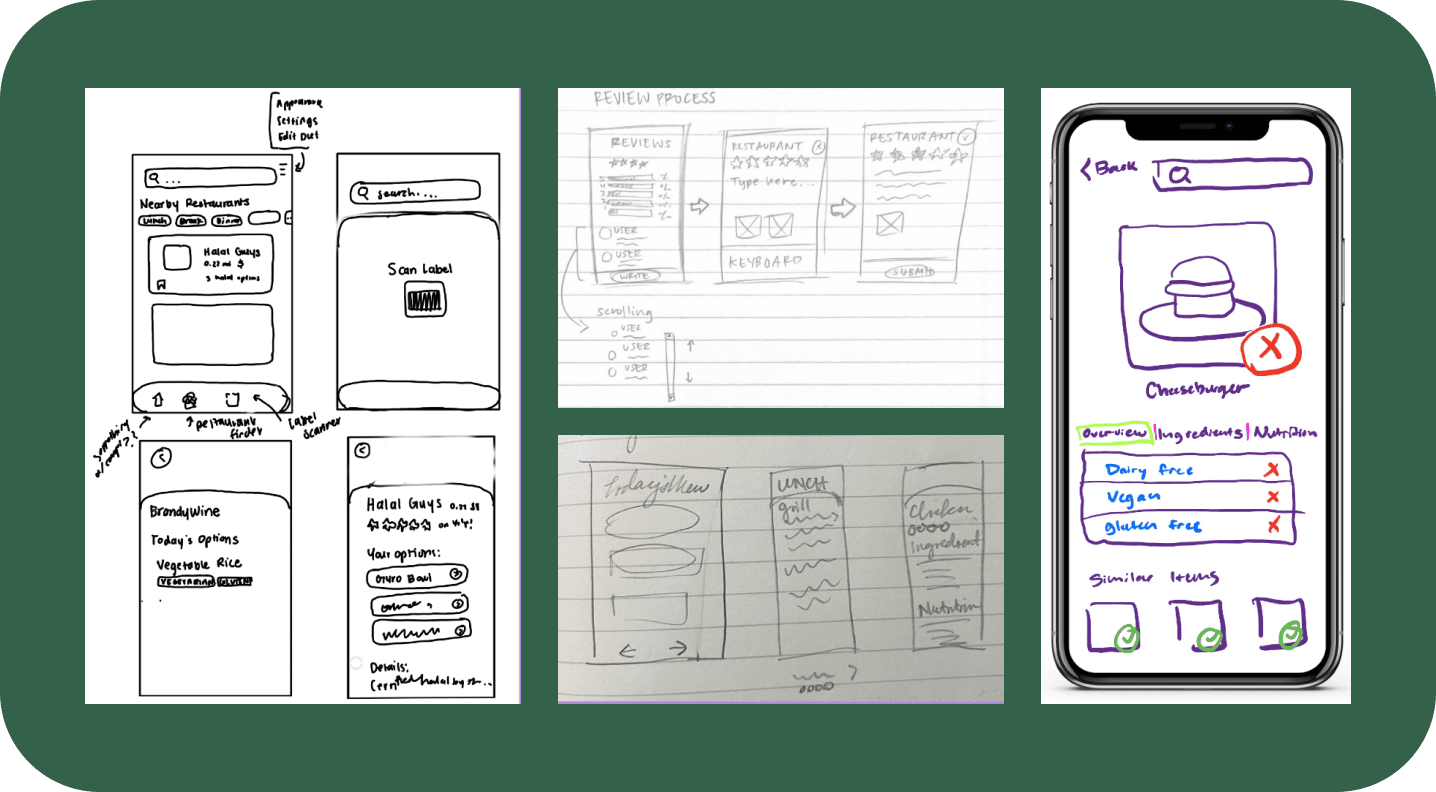 Once we identified accessibility and awareness as our users' primary pain-points, we could begin designing a solution. To begin this we began to brainstorm possible ideas for how we could implement such a solution. Some of these features included scanning food items for nutritional info, navigating restaurant and campus dining hall menus, and reviewing.